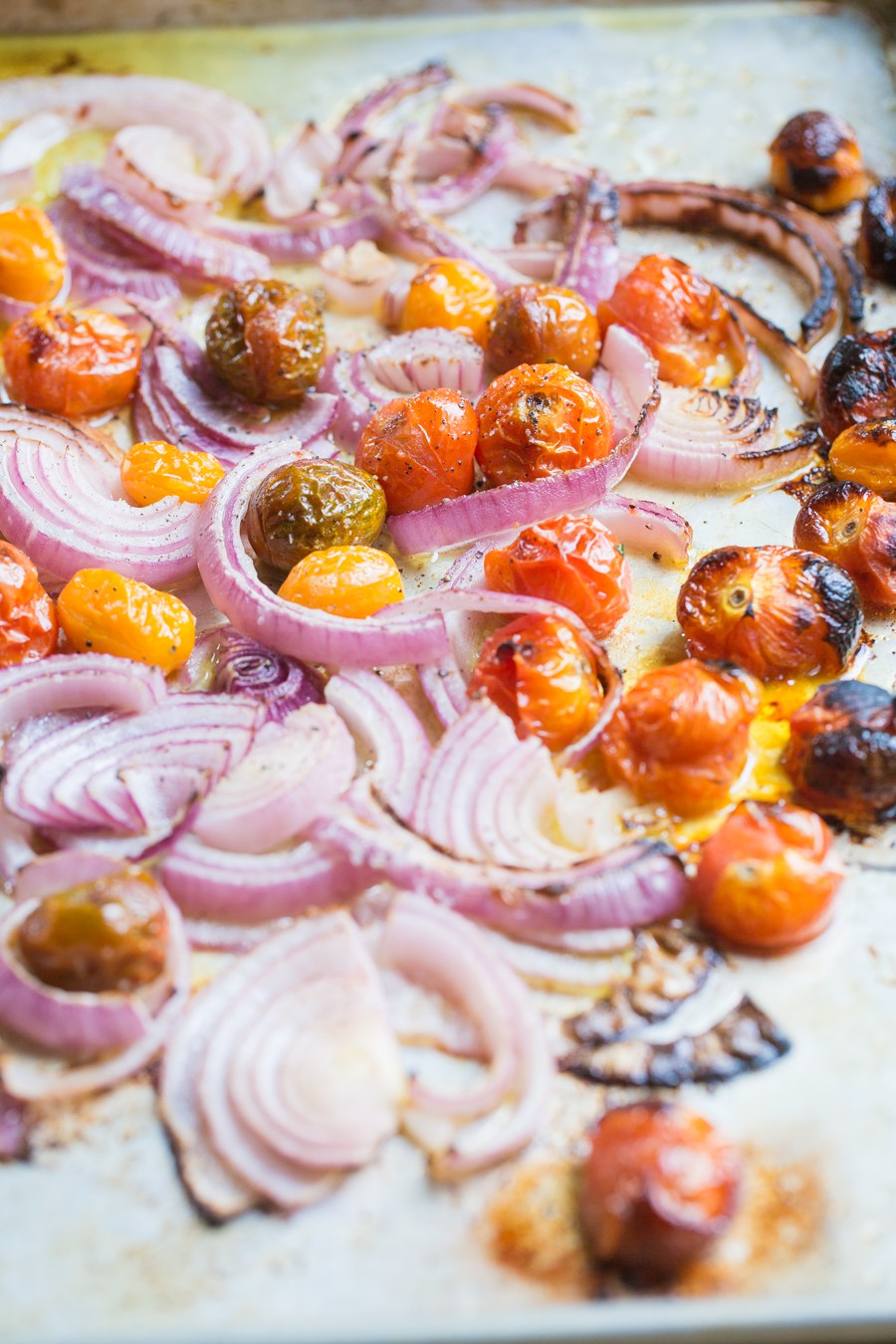 - Toss tomatoes and onion with remaining 1 teaspoon olive oil onto a baking sheet. Salt and pepper, optional.