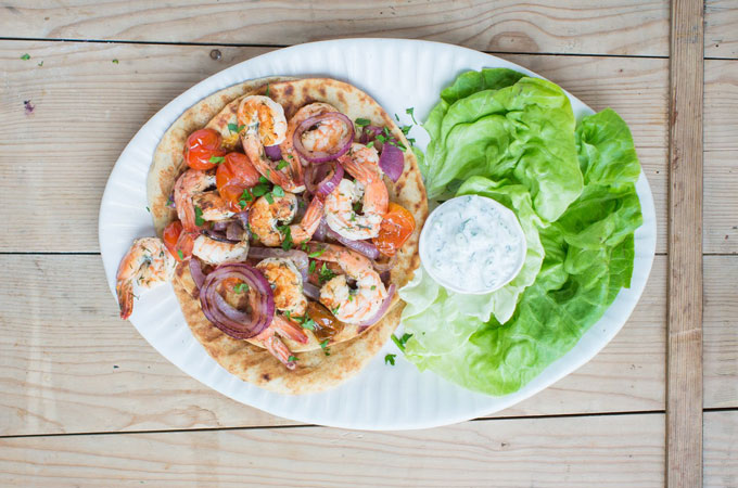 - Grill flatbread until golden brown and slightly crisp. Transfer to 4 serving plates; top evenly with cucumber sauce, shrimp, onions, tomatoes, and bib or romaine, if desired.