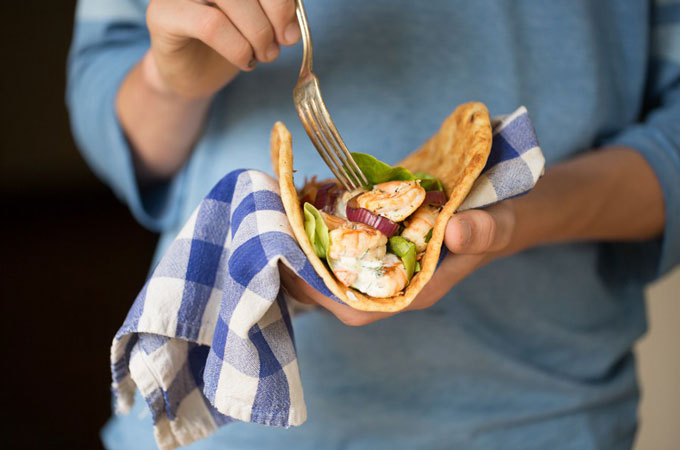 Heinen’s “4PM Panic“ series is all about dishes that take the stress out of weekday meal preparation. This week’s recipe is easy to take on-the-run so you have the option of enjoying it together, giving it to hungry kids on-the-go or packing it up to deliver between events.  Souvlaki is a Greek dish that is typically made with meat and served wrapped in a flatbread making it totally portable. Today I used shrimp to keep it light.  The cucumber sauce is a great fresh addition to the roasted vegetables and grilled shrimp.