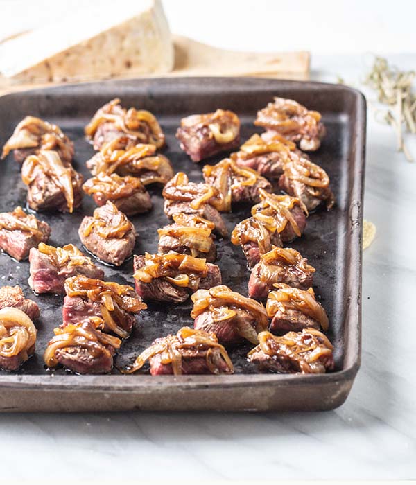 - Add a tablespoon of the caramelized onions on to the top of the steak bites.