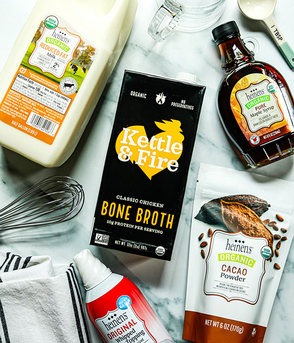 - Combine the milk and bone broth in a small saucepan. Heat to a simmer. Remove from the heat and whisk in the cacao powder. Sweeten with maple syrup to taste. Whisk in a splash of vanilla extract.