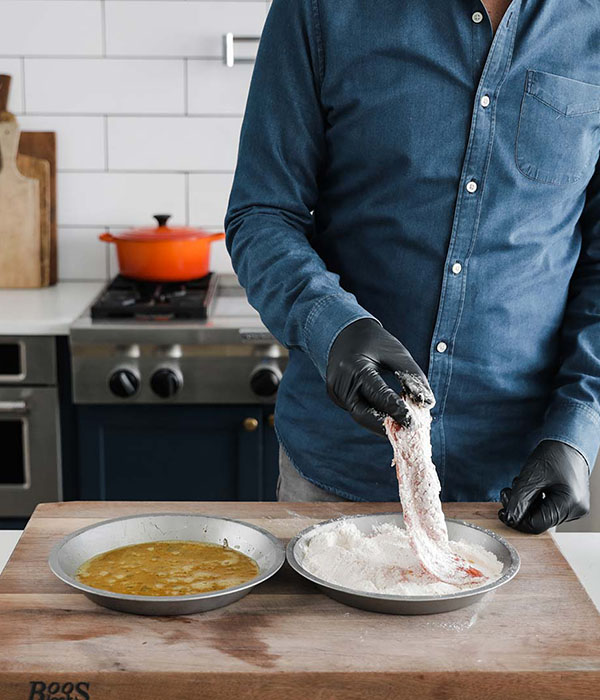 - Coat each steak, one at a time, in the egg mixture followed by the flour mixture until completely coated. Set aside on a cookie sheet tray or platter.