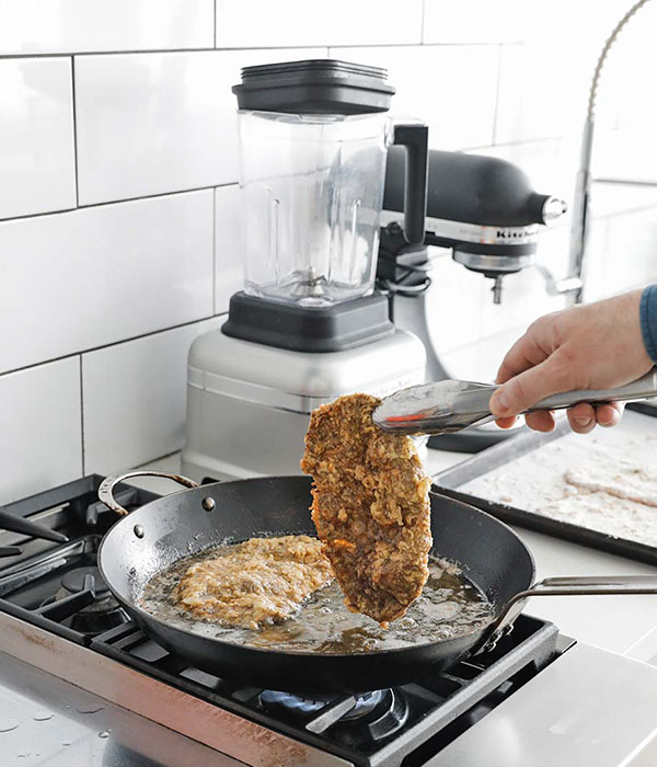 Once the meat is sliced and tenderized from the mallet, simply run it through seasoned whisked eggs and then into the seasoned flour before cooking it in oil. The steak will cook very quickly because it’s so thin, maybe 3-4 minutes per side. It will form a nice, browned outer crust that is so delicious.