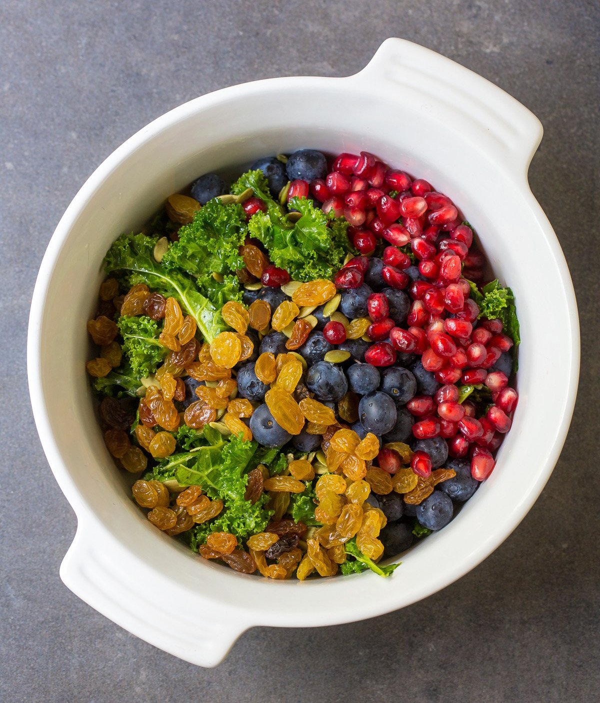 - Toss in pepitas, raisins, blueberries and pomegranate arils. Set aside.