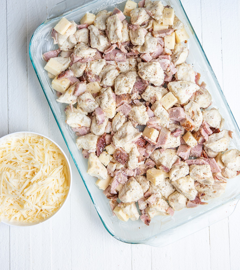 - Toss biscuits,ham and cheese with the melted butter mixture, then dump the entire mixture into prepared pan.