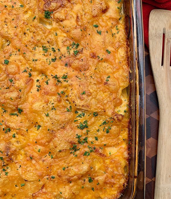 - Remove from the heat and stir in 1 cup of the cheddar cheese. Grease a 9 x 13 pan and start to layer your potatoes. Start with a layer of potatoes followed by a thin layer of onions, a pinch of paprika and some of the sauce. Repeat layers until you are out of the sauce.