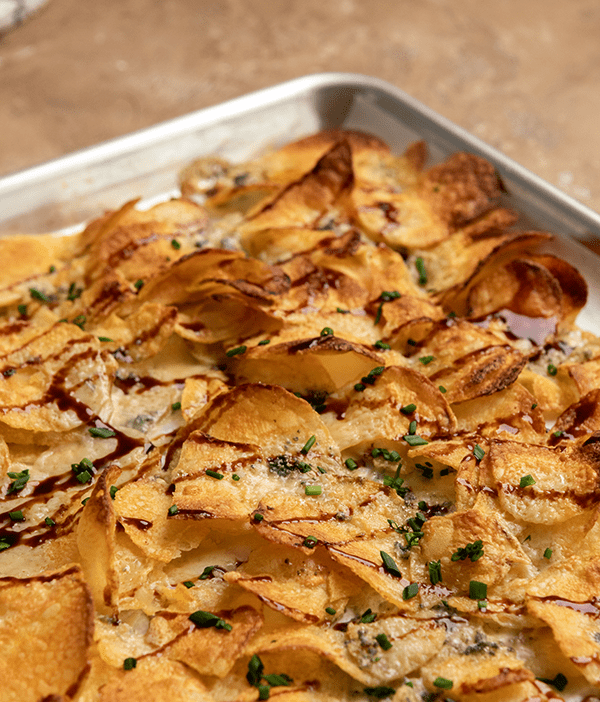Also known as the viral “Chippy Boys” on TikTok, this three-ingredient savory and crunchy snack calls for adding tangy Gorgonzola cheese onto Heinen’s Fan Favorite small batch kettle chips before broiling in the oven and finishing with a drizzle of balsamic glaze! The result is a simple and extremely satisfying snack that you can make in no time for yourself or a party!