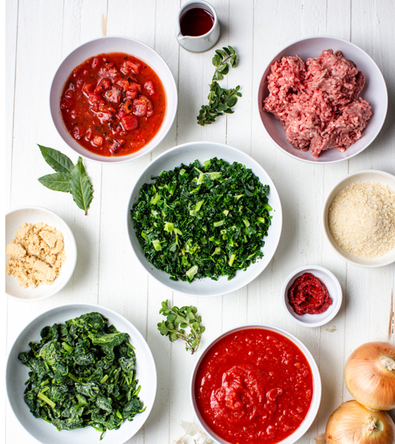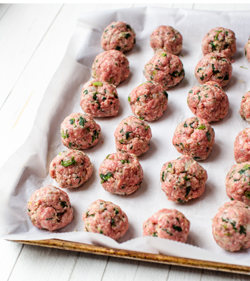 - In the large bowl with the cooked onions, add the spinach, organic beef, breadcrumbs, fennel seeds, oregano and egg with plenty of seasoning. Mix everything with your hands really well, then shape into 24 meatballs.