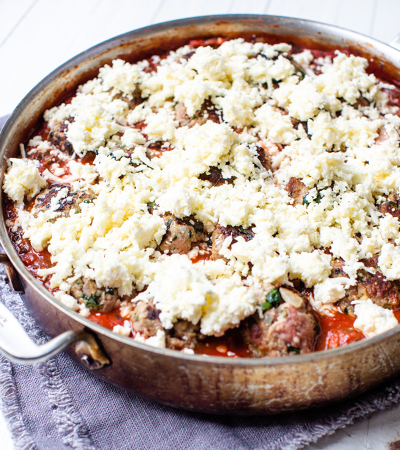 - Mix half of the grated mozzarella with the mascarpone and a little salt. When everything has cooled to room temperature, combine the meatballs and tomato sauce in a big baking dish. Spoon the cheesy mascarpone over top and finish with the remaining mozzarella.