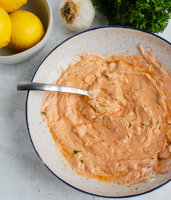 - In a medium bowl whisk together the yogurt, olive oil, lemon juice, garlic, thyme, paprika, cumin, oregano, cayenne pepper, salt and pepper.