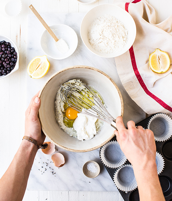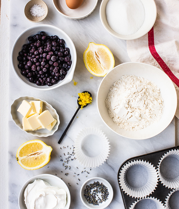 Blueberry Lavender Lemon Muffins. I wish computers had a smell feature because these muffins are divine. The combination of lemon zest, sugar and lavender mixed with the batter packed with blueberries smells fantastic. The use of lavender is fantastic here, but if you can’t find it you can omit it using just the lemon and blueberry. It’s still delicious. Did you know that dried lavender is edible? I first had it in the south of France, lavender gelato, it was amazing. I like to add it to simple cakes and muffins. I’m wondering if it would be good with a little honey on cheese? I’ll try that soon.