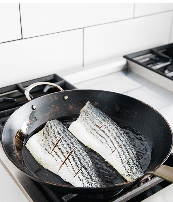 A fish-like Pacifico Striped Bass has exceptional skin which is fantastic when kept on and cooked crispy. Score the Pacifico bass on the skin side to make sure it doesn’t curl up when pan-searing. Also, be sure to season the fish well on both sides with salt and pepper.
