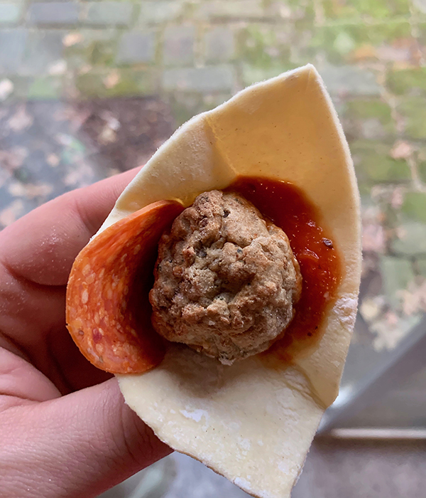 - Fold the pastry dough around the meatball and pepperoni. Gently roll into a ball.
