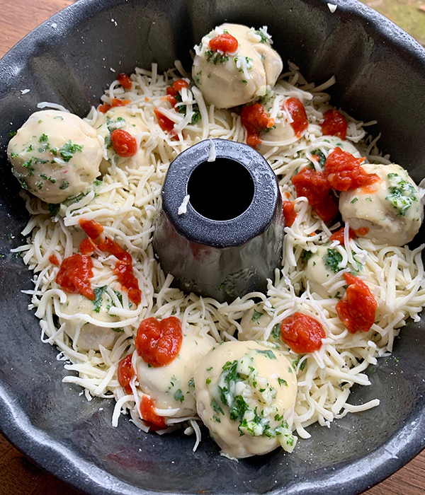 - Place half of the pastry dough balls into a bundt pan. Brush with a healthy amount of the garlic butter, 1/2 cup of mozzarella cheese and ¼ cup of sauce. Add the remaining pastry balls and repeat the process.