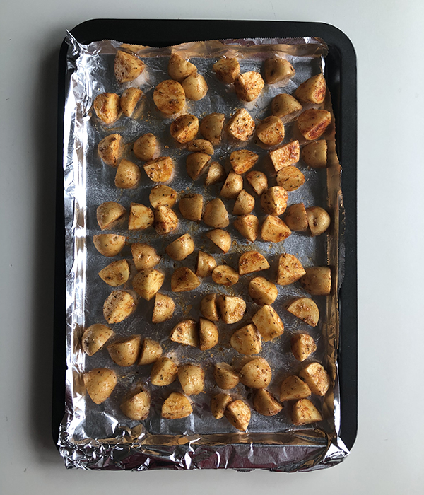 - While the pork chops are cooking, you can start prepping the brava potatoes by slicing them into quarters and adding them to a medium-size bowl along with 2 Tbsp. of olive oil and the seasonings. Mix well and place them on a foil-lined baking sheet. Pop them into a 400°F oven for 30-40mins flipping them halfway through the cooking time.