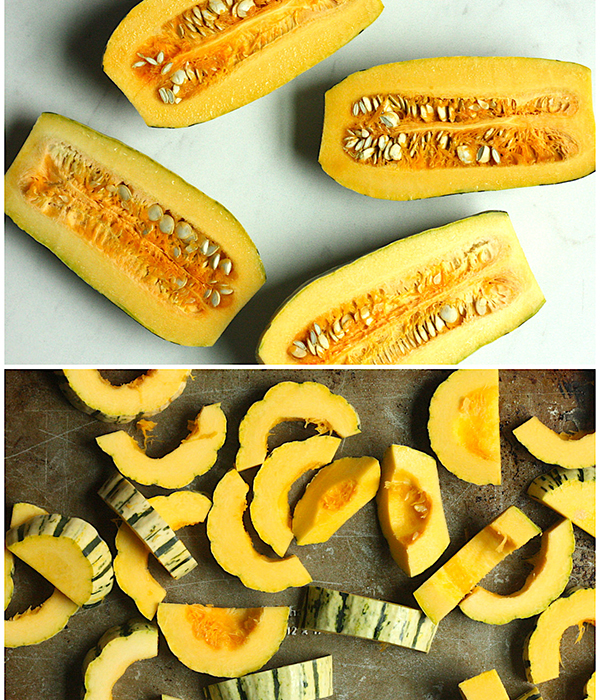 - Wash the squash well. Cut off the stem and root ends, then carefully cut squash in half lengthwise. Scoop out seeds, then cut each half into 1-inch moons. Place the squash and onions on the sheet pan and toss in the olive oil, sea salt and freshly-cracked black pepper to taste.