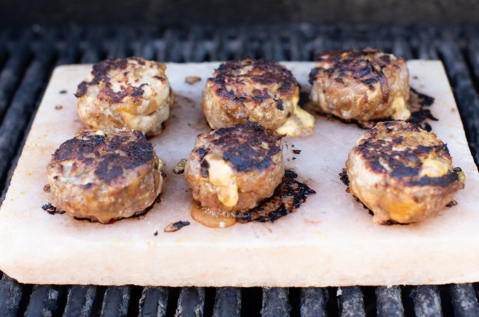 - Place the slider patties on the salt block. Let them sear on medium-high heat for approximately two minutes with the grill lid closed.