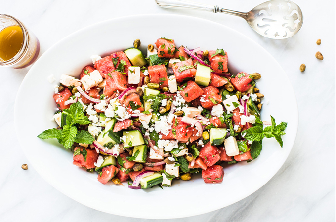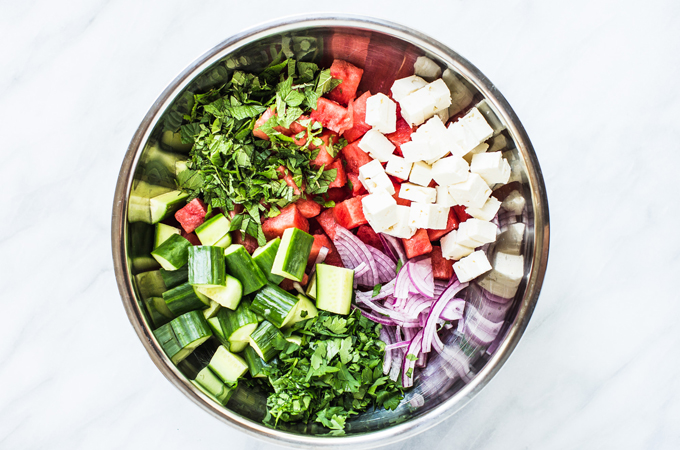 - Place watermelon, cucumber and onion in a large bowl. Add herbs, feta and pistachios.