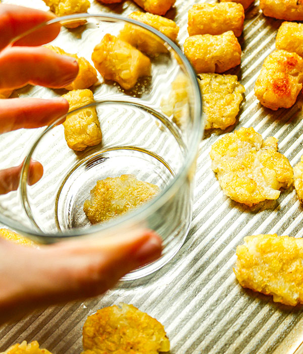 - Arrange the tater tots in a single layer on the baking sheet; bake for 20 minutes. Remove the pan from the oven and use the bottom of a glass to flatten each tater tot (spray the bottom of glass with oil spray to reduce sticking).