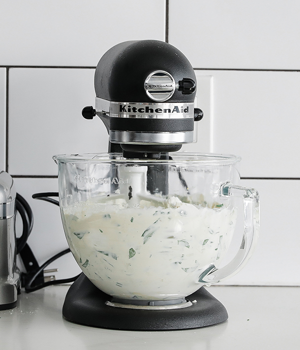 - In a stand mixer with the paddle attachment, add the ricotta, mozzarella cheese, spinach, parmesan, eggs, salt and pepper until completely combined.