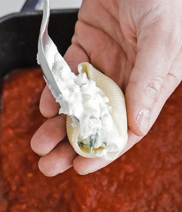 The sauce that goes underneath and on top of the shells can be a family favorite recipe, a can of crushed tomatoes or better yet, Heinen’s Tomato Sauce. It can be as simple or as complex as you’d like or need.