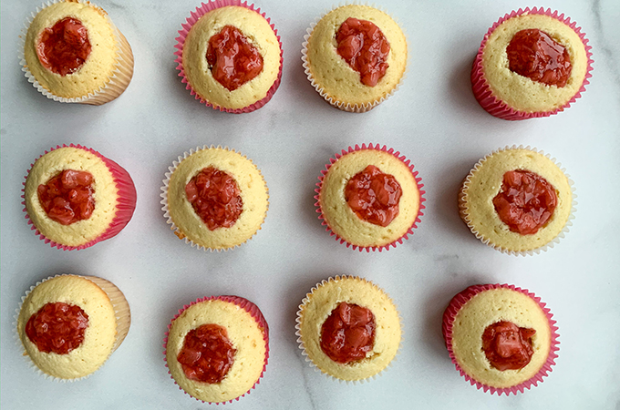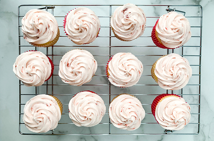 - Using a small spoon, scoop out the center of the cooled cupcakes in about a 1-inch diameter circle, leaving an edge on the sides of the cupcakes. Fill the centers with the remaining strawberry filling. Using a plastic bag fitted with a pastry tip, pipe the frosting on top of the cupcakes. Place halved strawberry on top of the frosting.