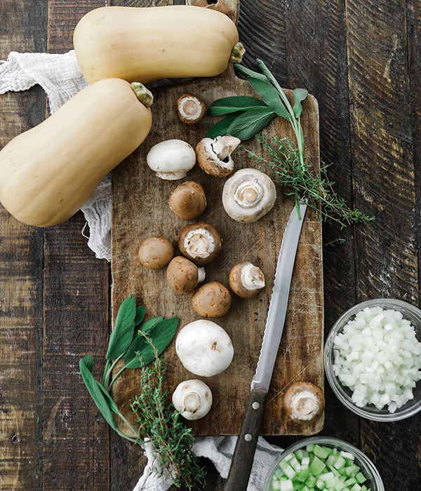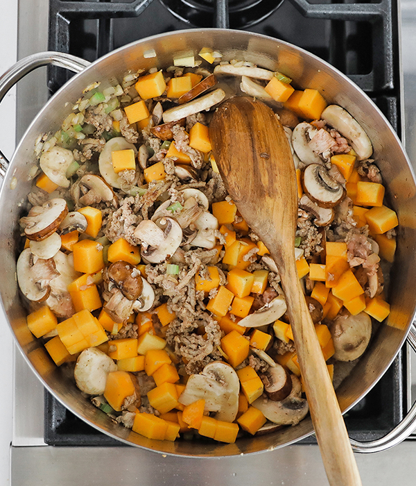 - Once crisp and browned, remove the bacon from the pan and set aside. Add the turkey, onions, celery, garlic, mushrooms and squash and cook until the turkey is cooked through about 5-6 minutes.