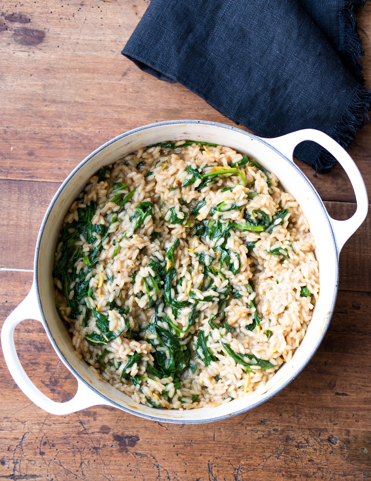 I’m serving my lamb and scallops with risotto cooked in bone broth and tossed with sautéed spinach and lemon zest. I recently had it at a friend’s house (Thanks Jane). Some people are intimidated by the preparation of risotto but don’t be shy. It’s easy and delicious. Simply follow the package instructions. Use fresh stock or prepared broth to the rice slowly to allow it to absorb as it cooks. Once tender, toss in zest of one lemon and a bag of spinach that you have sautéed until slightly wilted.