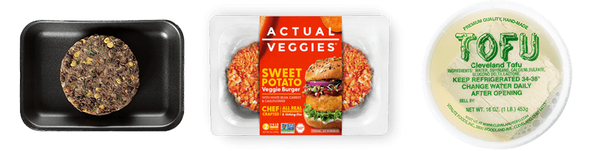 - Actual Veggies Veggie Burgers: Also located in the Meat Department, these bean and vegetable burgers are made from real food and no junk! Varieties include truffle (with shitake mushrooms, oats and chickpeas), black (with black beans and carrots), orange (with sweet potato, carrot, cauliflower, and navy beans), and green (with kale, broccoli, spinach, pea and navy beans).