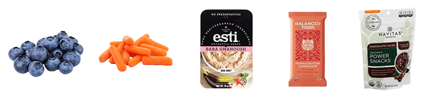 - Snacks: Fresh fruit; Raw vegetables with Esti baba ghanoush for dipping; Balanced Tiger nutrition bar; Navitas Power Snacks