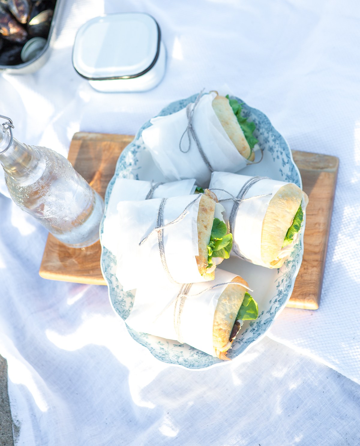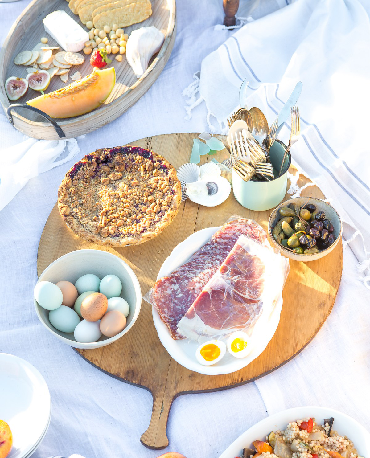 - Bring several table clothes and/or Turkish towels to spread out for a backdrop for your food as well as seating. The latter are lighter and sand doesn’t accumulate in them as much as a terry towel or textured blanket.
